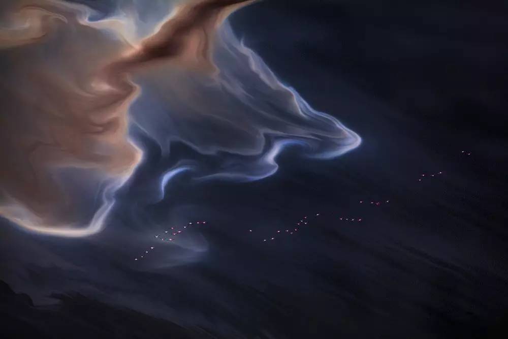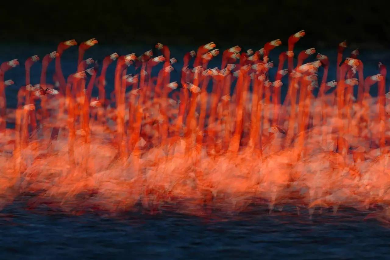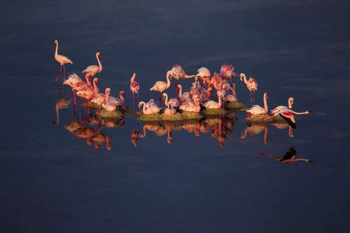 优雅的火烈鸟聚集在一起,湖光鸟影,交相呼应,远远望去,仿佛一片奇妙的微光世界。