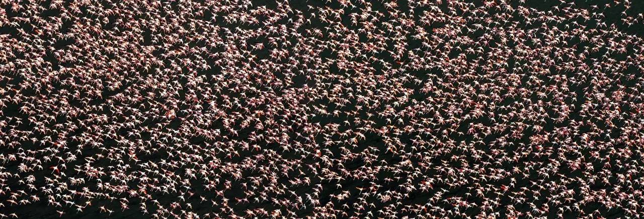 位于坦桑尼亚北部和肯尼亚南部交界处的纳纯湖是东非火烈鸟生命的摇篮,东非百分之八十的火烈鸟都在这个神奇的湖泊上出生。每年的二、三月份,分散在东非各个湖泊的火烈鸟都要飞到这里来产卵,孵化幼鸟,场景蔚为壮观。