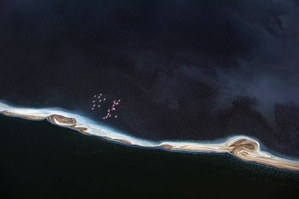 富含矿物质的土壤与高盐碱度的湖水在光线的反射与折射下,会呈现出扑朔迷离的色彩组合,与云彩的倒影、细腻的波纹、浮游的鸟儿一起,构成错综复杂的视觉关系,就好像上帝在这里用大自然的颜料创作的画作。