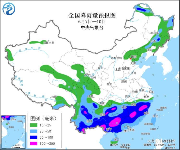 据中央气象台网站消息,预计高考和端午假日期间(6月7日至10日),南方地区有较强降雨天气过程。西南地区东部和南部、江南中南部、华南有中到大雨,云南南部、贵州东部和南部、广西、广东北部、湖南西部和南部、江西中南部、福建西部和北部等地部分地区有暴雨或大暴雨;累计降雨量有50~80毫米,云南南部、贵州南部、广西东部、湖南西部、江西南部、福建西北部等局地有100~180毫米;上述部分地区伴有短时强降水(最大小时降雨量20~50毫米,局地60毫米以上)或雷暴大风等强对流天气;此外,华北北部、东北地区等地多阵雨或雷阵雨,局地并伴有8~9级雷暴大风。