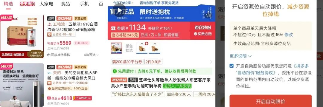 拼多多同时推出了自动跟价系统。官方给出的介绍是,开启资源位自动跟价功能,即代表委托平台在商家设置的价格范围内自动改价,以保持百亿补贴、限时秒杀、品牌秒杀、大促活动等资源位不掉线。关于单个商品的单天最大降幅,阈值可以随时调整,单天最大调整金额为10元-999元,单天最大调整幅度为15%-100%。除了营销活动首页的开启入口,商家在后台切换页面时,也可能收到自动跟价的弹窗。
