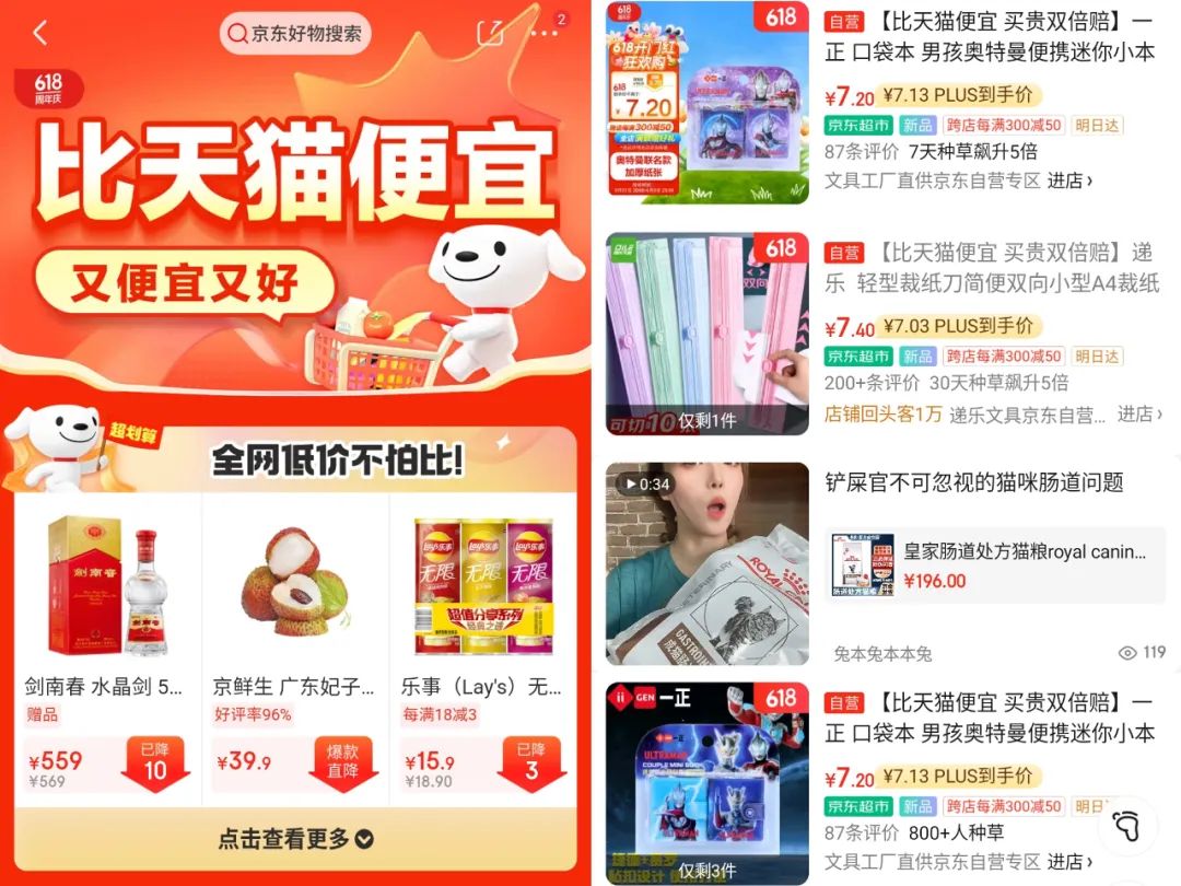 京东同样如此。如果在京东App搜索“比天猫便宜”,会跳转至类似页面,而且表达毫不避讳——除了“比天猫便宜”五个大字,京东还添上了一句“又便宜又好”,这也是其2024年618的主题。页面下方,吉祥物Joy手持印有“超划算”的小旗,提醒用户接下来十几个板块的商品“全网低价不怕比”,一些商品名称前甚至标注了“比天猫便宜 买贵双倍赔”。