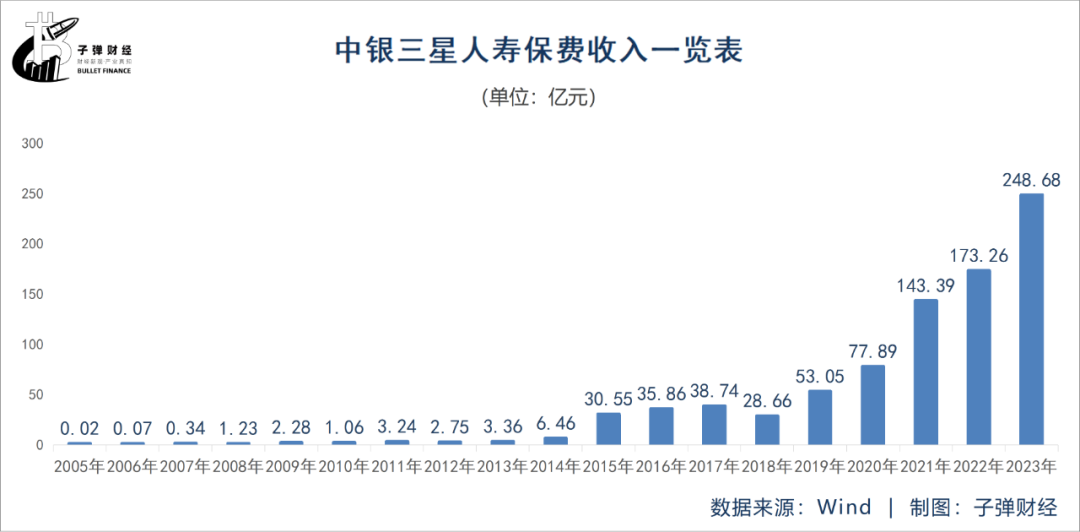 2021年中银三星人寿突破百亿大关,2021年至2023年分别实现保费收入143.39亿元、173.26亿元、248.68亿元。