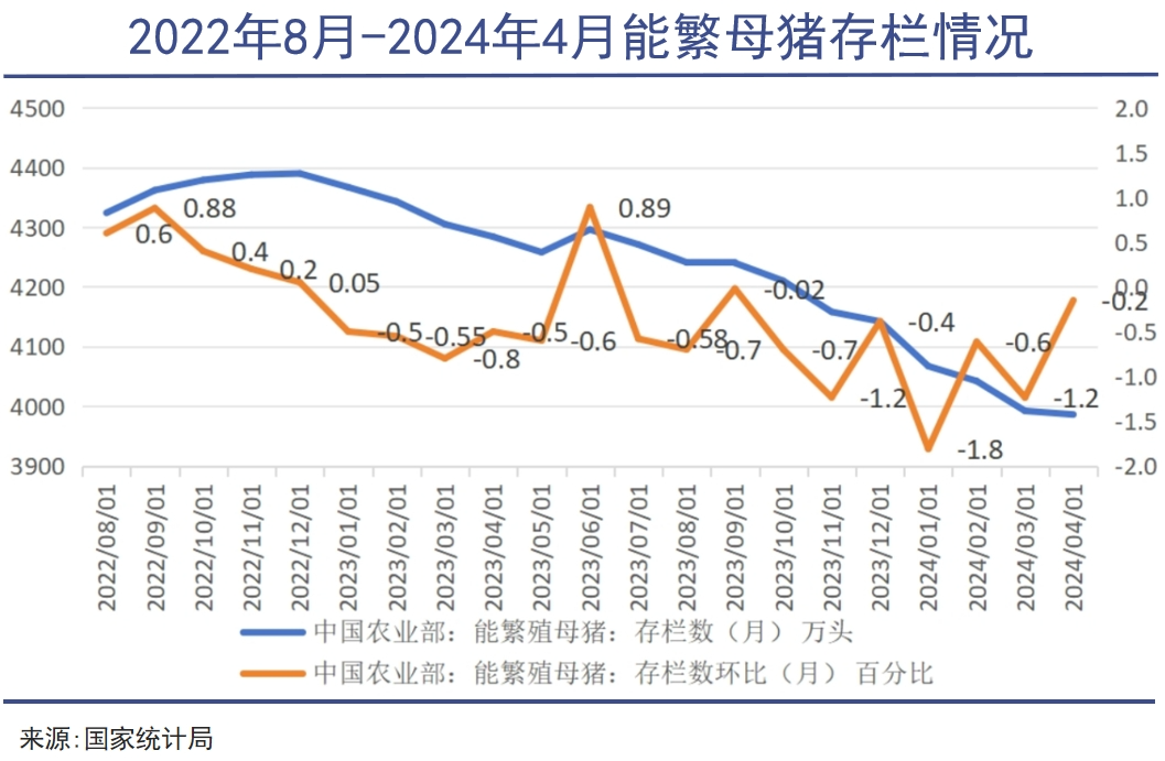 国家统计局数据显示,4月全国能繁母猪存栏3986万头,已连续10个月回调,能繁母猪存栏相比22年高点已去化9.20%,相比21年高点已去化 12.66%,可以说供应已经偏紧。