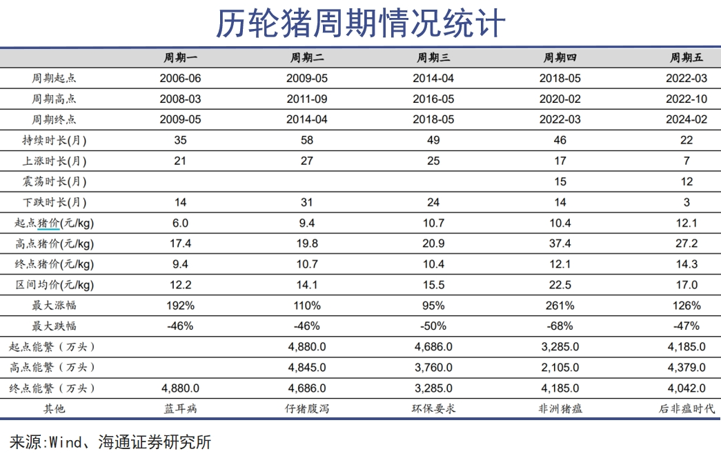 猪价往往4月见底,5-8 月上涨,9-11月小幅下跌,12月及次年1月再度涨至高点,2-4月下跌。只是上一轮猪周期中(2018-2022),猪肉价格变化幅度远超前几轮,最大涨幅高达261%,最大跌幅高达68%。