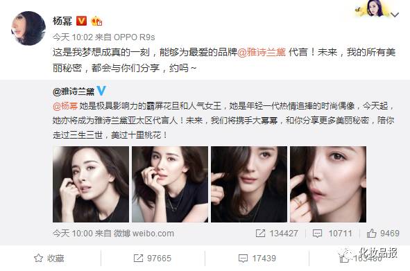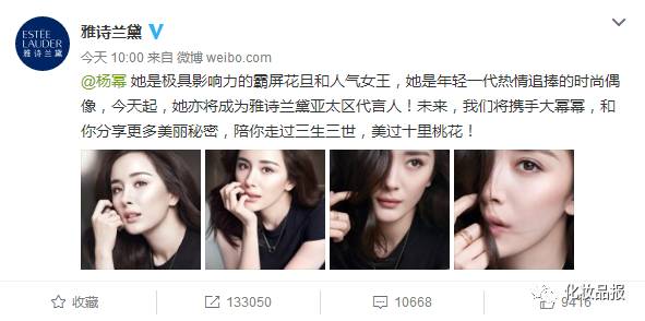数据显示,在雅诗兰黛发布这一官方消息之后仅3个小时,该条微博的转发量已超过13万,评论人数过万。而杨幂转发该条微博后的转发量也近10万,评论人数近2万,可见传播速度之快。而这也正是雅诗兰黛所乐见的。