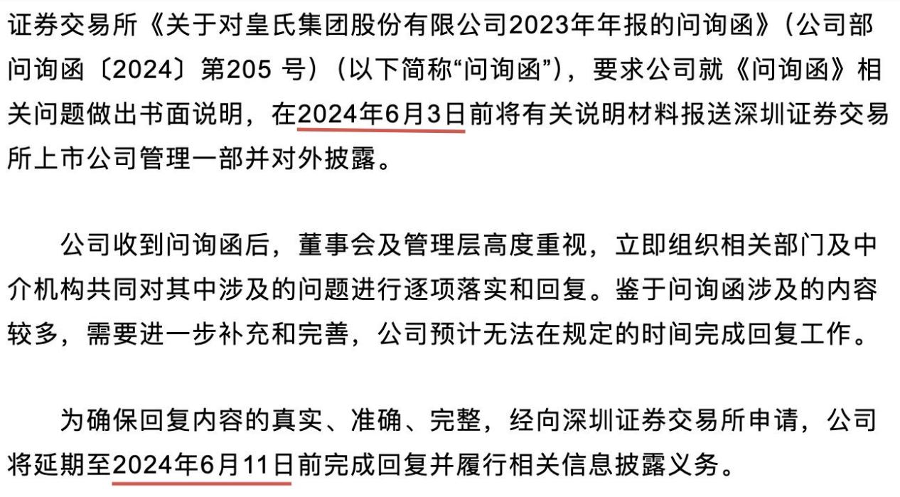 深交所要求皇氏集团6月3日前给出答复并向外界披露,但公司方面申请延期,称只能6月11日前完成回复。