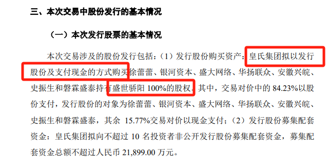 2015年,皇氏集团又通过发行股份及支付现金方式收购盛世骄阳100%股权,交易作价约8亿元。盛世骄阳是一家从事组织文化艺术交流活动、设计、制作、代理、发布广告等业务的公司。