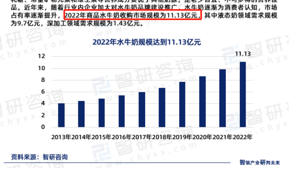 首先,水牛奶这一细分领域整体上机会不大。根据智研咨询研究,2022年国内商品水牛奶收购市场规模仅11亿元。其发展主要受到种源引进限制、奶源不足、行业发展不规范等客观因素的制约。