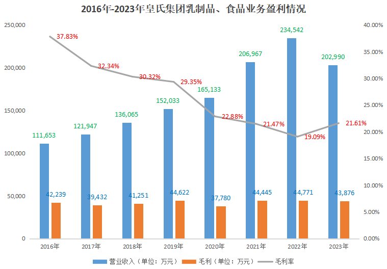 其次,2018年至2023年,随着乳制品、食品业务成本逐渐上升,皇氏集团的相关业务毛利率持续下降,毛利水平始终徘徊在4亿元附近。