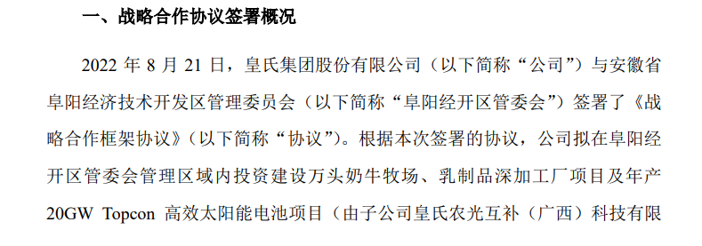2022年,皇氏集团又切入光伏领域,其联营公司宣布投资建设20GW Topcon超高效太阳能电池和2GW组件项目,以及新能源分布式光伏项目。