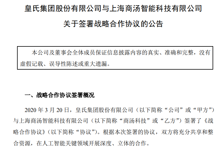 2020年3月,皇氏集团向智能化方向寻求跨界机会,与商汤智能科技签署协议,计划共同在广西、山东等省市推进数字城市项目落地。