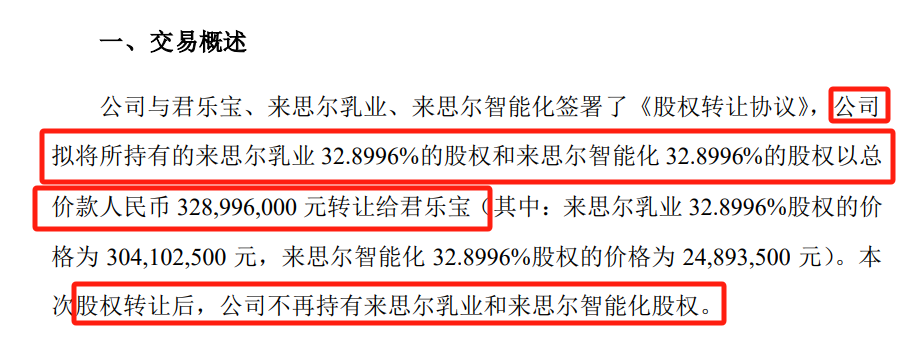 2023年5月,皇氏集团将所持有的全部来思尔乳业、来思尔智能化股权以总价款约3亿元转让给君乐宝,用于支付贷款本金。