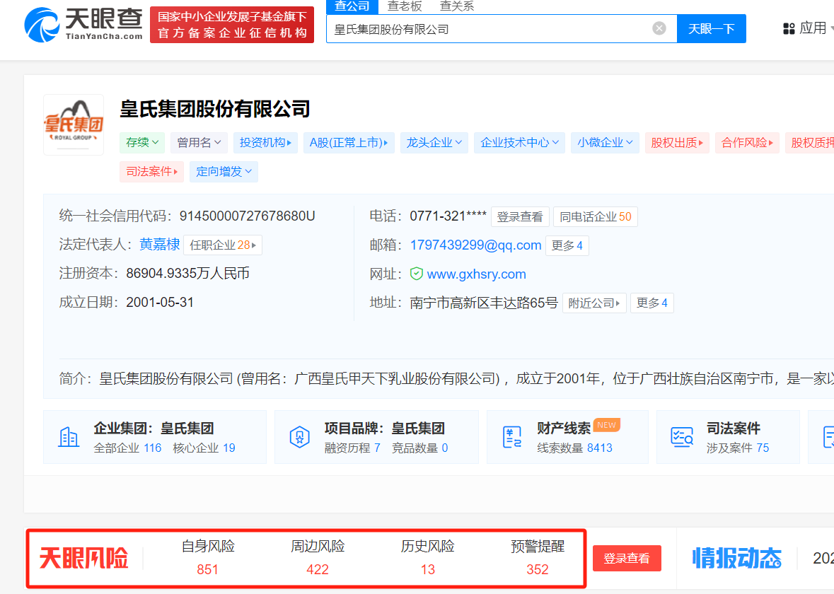 另据天眼查信息显示,皇氏集团自身风险高达851项,周边风险也超400项。