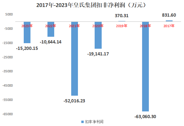 如果把时间线拉长,2017年至2023年的7年中,除了2017、2019年分别小小地盈利831、310万元,其余年度皇氏集团扣非净利润均为大幅亏损,六年累计亏损约16亿元。