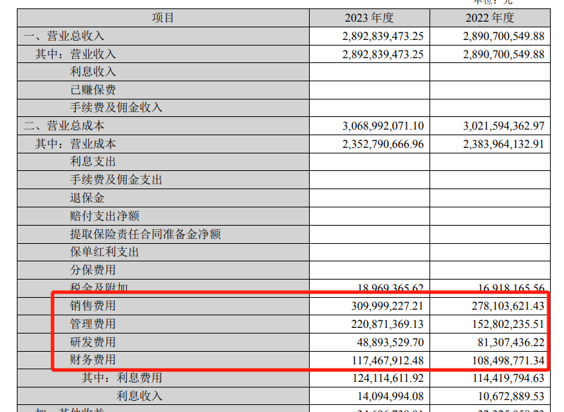 2023年皇氏集团总成本同比增长4740万元,其中销售费用、管理费用、财务费用三项分别同比增长11%、45%、8%,研发费用反而同比减少40%。