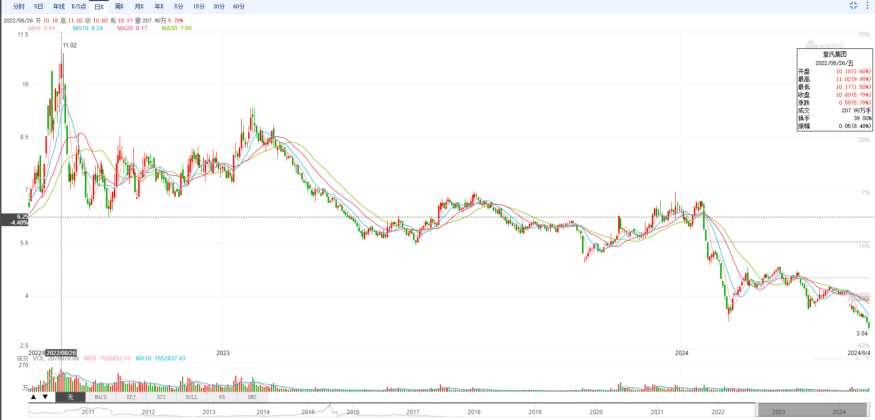 截至2024年6月4日收盘,与2022年8月26日阶段高点11元相比,已累计下跌70%以上。