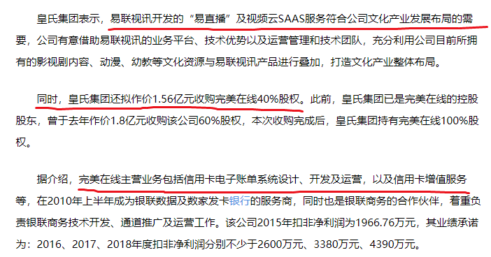 2016年5月23日,皇氏集团连发两则公告,宣布收购易联视讯30%股权,收购完美在线40%股权,合计耗资约3亿元。
