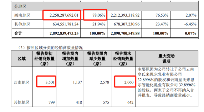 而2023年年报显示,皇氏集团西南地区营收占比达到78%。