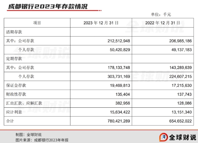 但不得不说的是最终的揽存效果十分惊人。2024年一季度末,成都银行活期公司存款、活期个人存款、定期公司存款、定期个人存款分别为2219.67亿元、504.22亿元、1839.37亿元、3423.83亿元,相较2023年底,活期个人存款仅增加了146.3万元,定期个人存款却增加了386.52亿元。