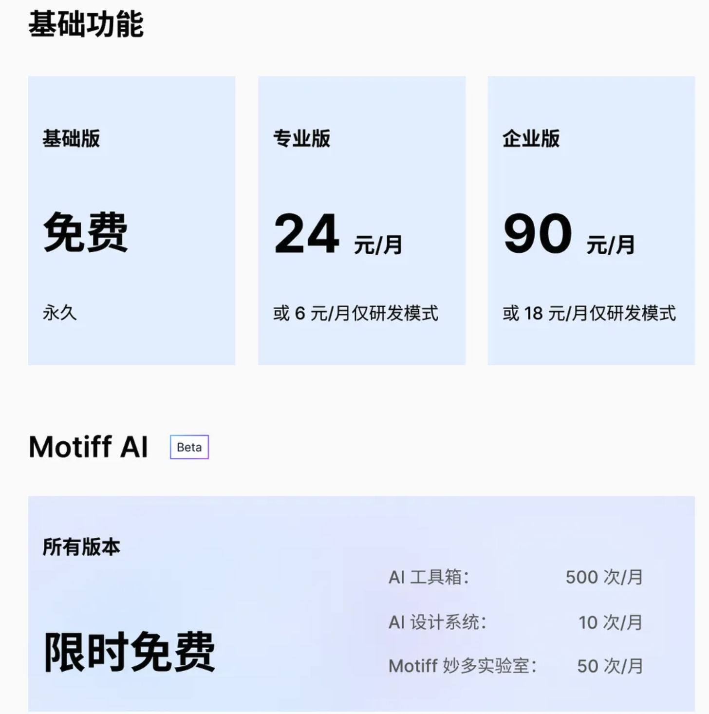 6月5日,由猿辅导旗下看云软件研发的Motiff妙多面向全球发布并公布定价。据了解,Motiff妙多面向全球市场统一定价,基础功能收费分为三档:除了免费版之外,专业版基础功能价格为24元/月(国际版4美元/月),研发模式6元/月(国际版1美元/月);企业版基础功能价格为90元/月(国际版15美元/月),研发模式18元/月(国际版3美元/月)。以此计算,企业采购的综合价格相比Figma低80%以上。