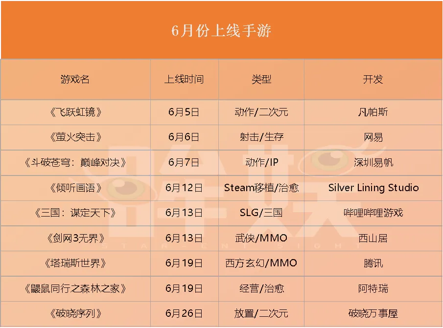 6月共有9款新游上线,其中值得关注的有网易的射击游戏《萤火突击》,哔哩哔哩的《三国:谋定天下》,西山居的《剑网3无界》以及腾讯的《塔瑞斯世界》。