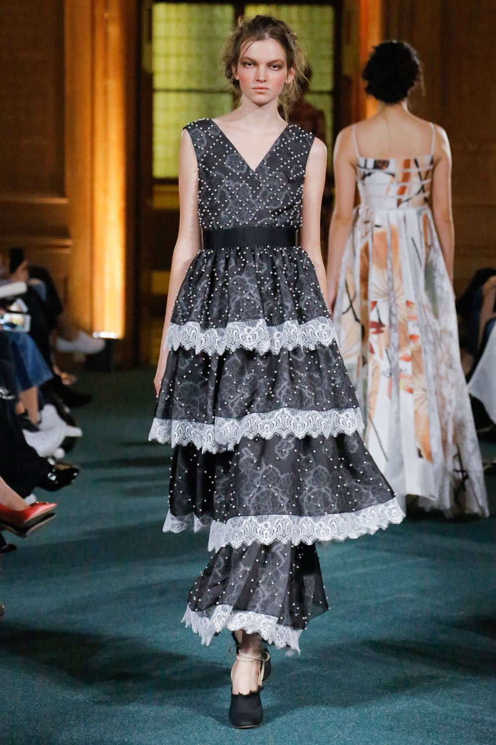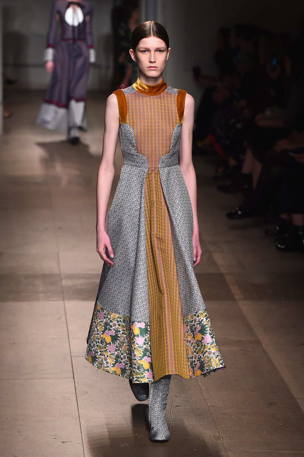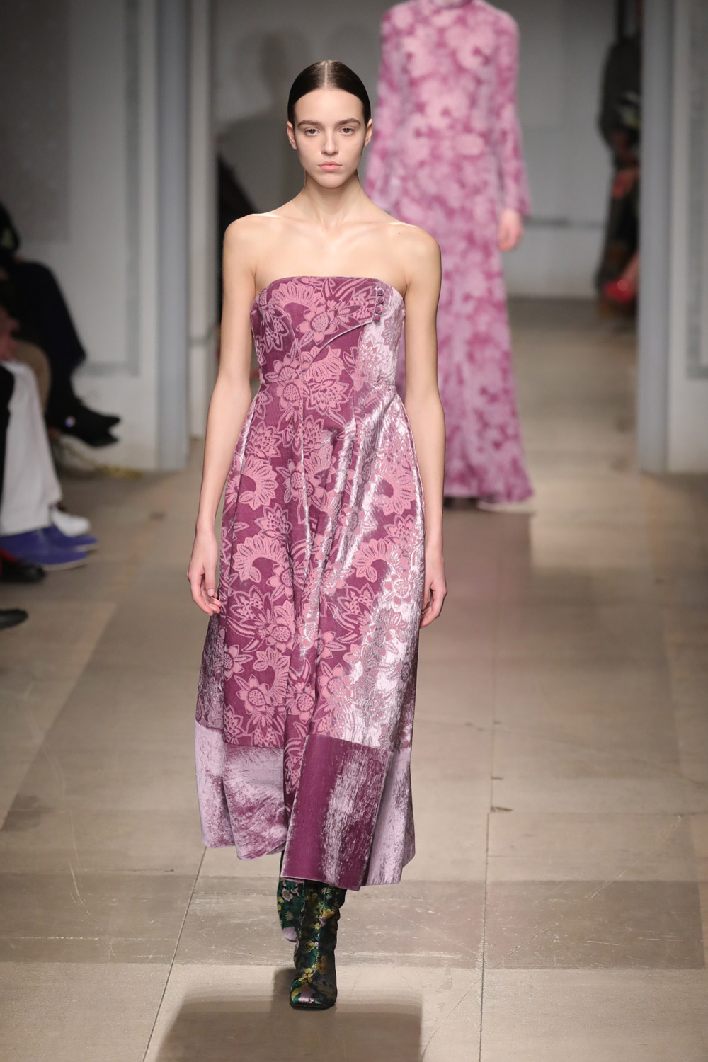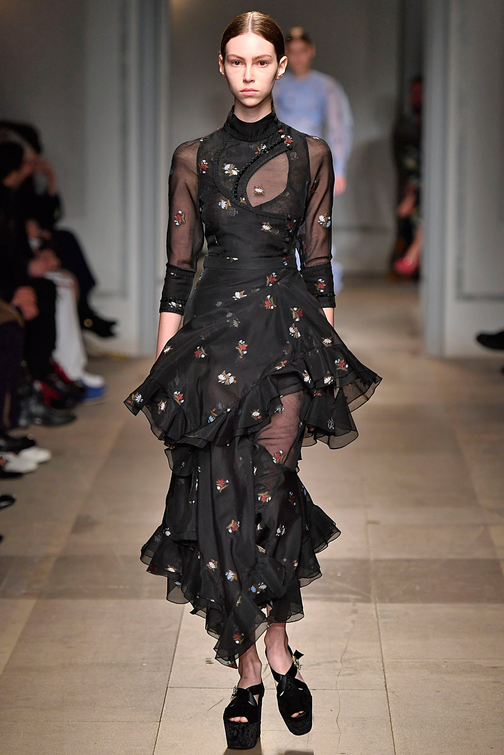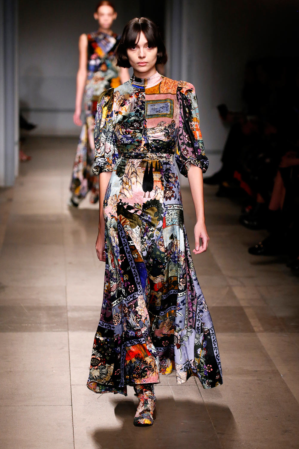 长设计英伦风优雅裙装的Erdem这一季依旧把看家本领玩出了花。从面料上,丝绒、蕾丝、棉布、薄纱、缎面布材都有使用。在颜色和印花上,同为花朵元素,也有不一样的演绎。而裙子的剪裁,尤其是上身部分在领口和胸口处的处理,也丰富有趣。虽然都是及踝长裙,但每条裙子可不是一个“仙”字就能概括的。