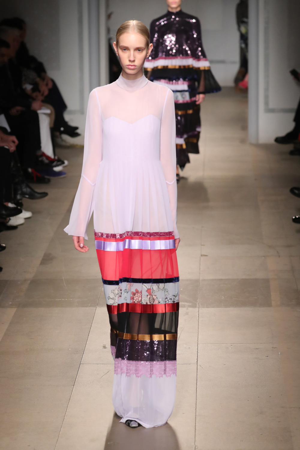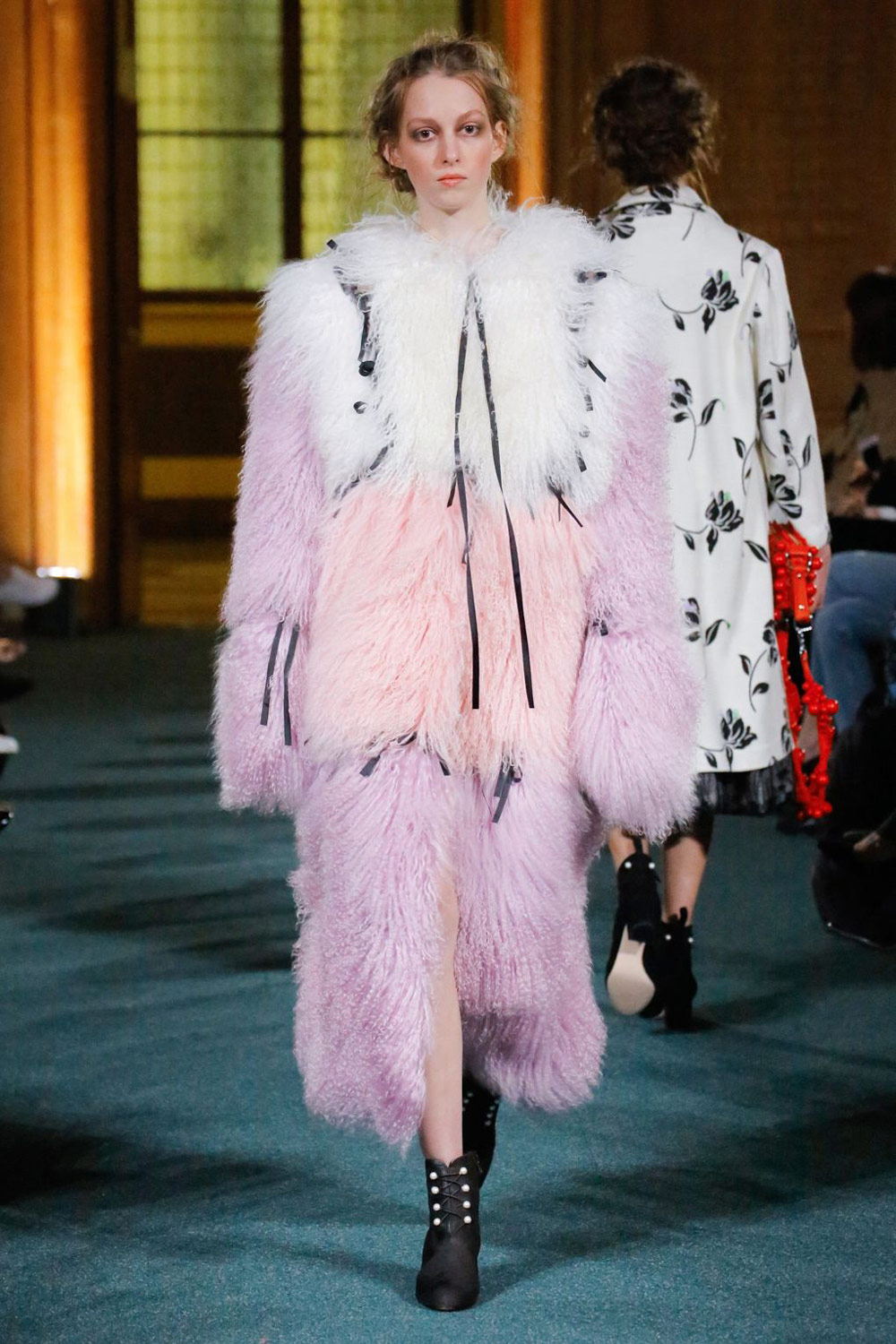 张卉山追求精致的努力还有很多。比如,几条裙子的裙摆都以松散的布片形式呈现,让底下的蕾丝若影若现,而每一个布条又能拼成一幅画。又比如,丝绒布条成为了用以强调成衣裁片车线的点睛细节。另外,虽为秋冬系列,整个系列中仍出现了不少淡淡的粉蓝、粉红和粉紫色,但这些颜色有的是被以不同色丝绒布片拼接的形式做出一幅集合图样。有的则做了更复杂的处理:颜色被做成一个个色块,层层叠叠地被摆在一起,伴随模特的脚步飘逸、摆动起来。