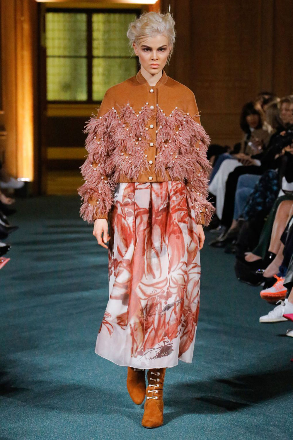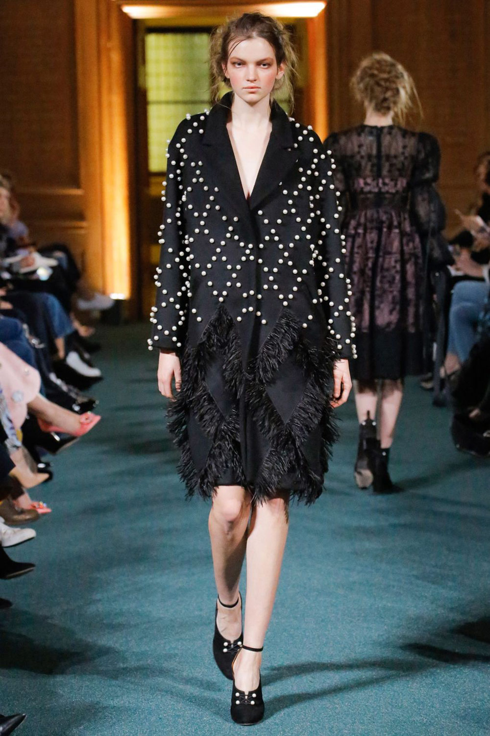 前几季诸如花朵印花、羽毛装饰这样的核心设计在这一季得到了保留,而新加入的诸如珍珠一类的元素进一步延展了品牌一直以来追求的女人味。这些珠子有的出现在裙装的车线上,有的布满了整个手包,也许能成为一些人眼中“精致”、“重工”的标志。