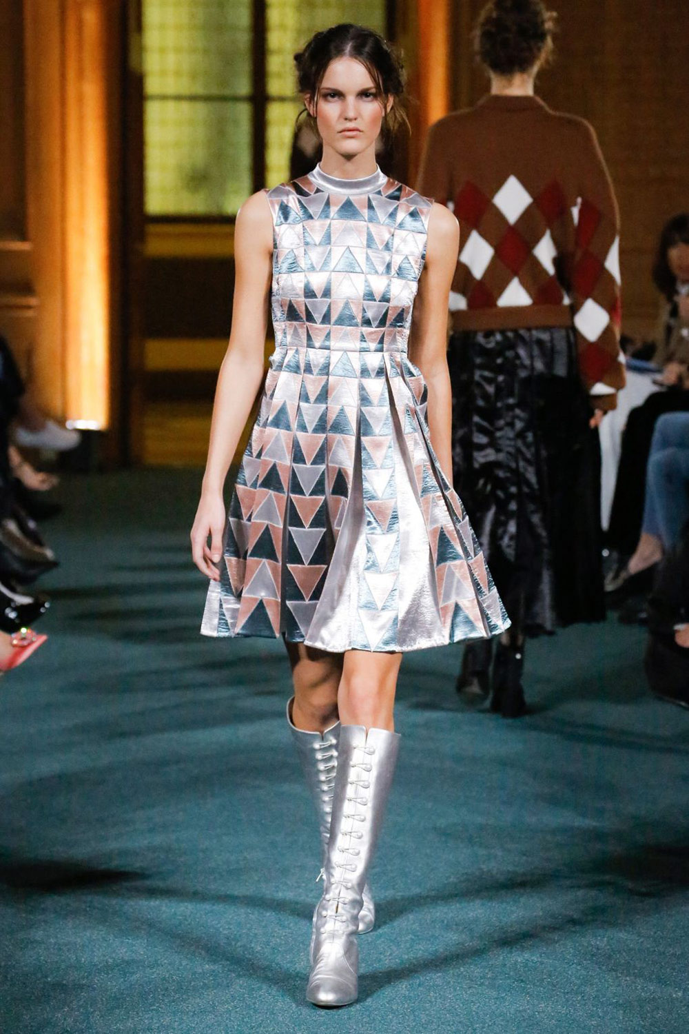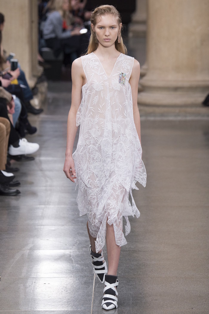 想找条有个性却不出格的裙装可以看看Christopher Kane2017年秋冬的这个系列。看起来方方的两片薄纱吊带裙,又或是银灰色丝质衬衫裙,都是符合要求的选择。而珠光金属色针织以及衬衫连衣裙也都不错,还可以考虑下那些在胸口处做出菱形凸起的无袖及短袖连衣裙。
