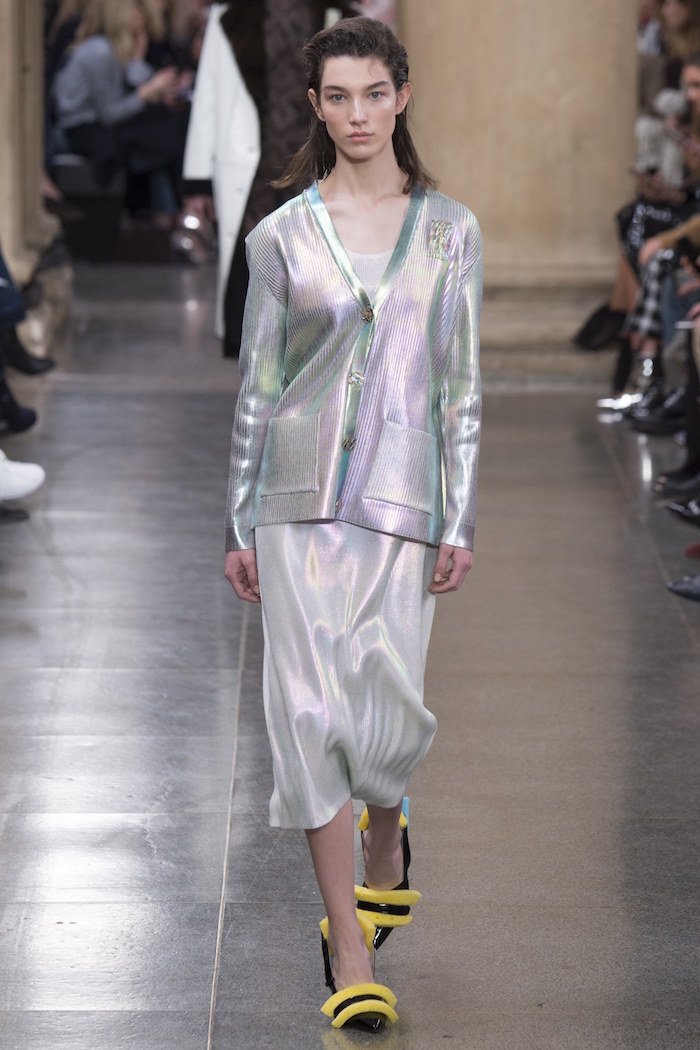 而除了裙装,同样有趣的还有针织衫衫的部分。颜色丰富是一方面,有粉色、白色、珠光金属色和绿色。另一面,不管看到错位的门襟,还是无处不在的层叠口袋,这些针织衫本身的细节设计也充满惊喜。