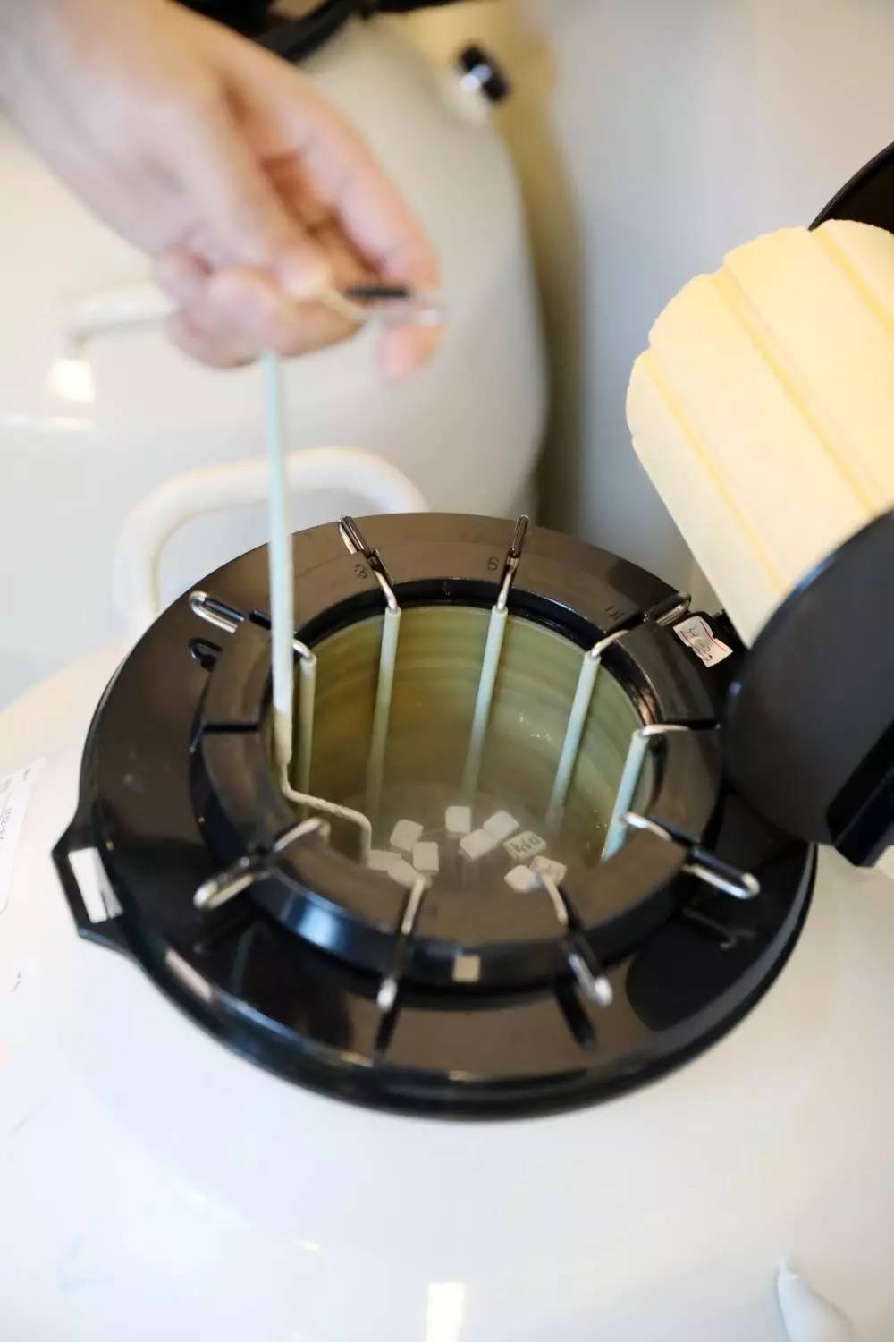 生殖中心主任邓伟芬称,实验室在深圳是最早采用玻璃化冷冻的,胚胎冷冻后的复苏存活率在99%左右。与传统的慢速程序化冷冻不同,玻璃化冷冻是瞬时降温,胚胎中的水与冷冻保护液替换,在零下196℃的液氮中,形成了玻璃化状态,不会像水一样易形成冰晶,因此能减少胚胎的机械化损伤和渗透压的剧烈变化。