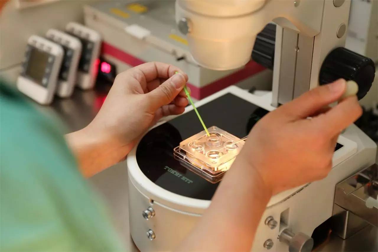 速度是一切的关键。一对夫妻同时取完卵子和精子之后,实验室会在1小时内对精子进行优化处理,将卵子从卵泡液和血液混合液中拣出来。由于卵子很脆弱,在低于37℃的环境下,超过10分钟就会发生不可逆的损伤,他们必须在5分钟之内把10个卵子处理完。只有经过长期的培训,才可以正式在拣卵岗进行操作。随后,精子和卵子分别在模拟人体的环境中预培养后混合。如果精子数量低于300万个或有受精失败史等原因,就会采取二代试管婴儿技术,即单精注射。他们最慢要在一分钟内注射完一个卵子。