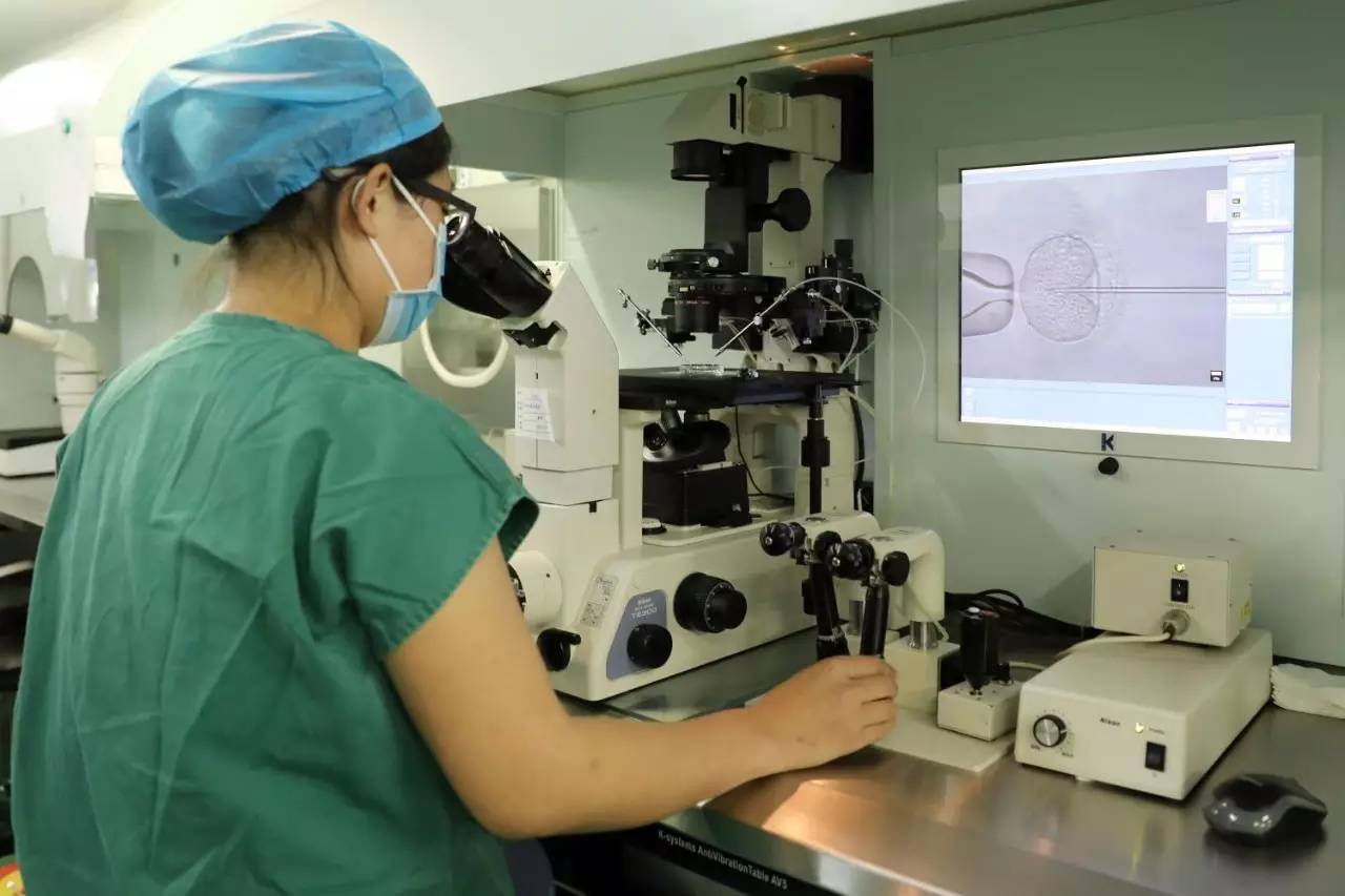 在深圳武警医院生殖中心实验室,胚胎学家吴迪在显微镜下操作单精注射,将来自父亲的精子注入到来自母亲的卵子中,从而产生受精卵。