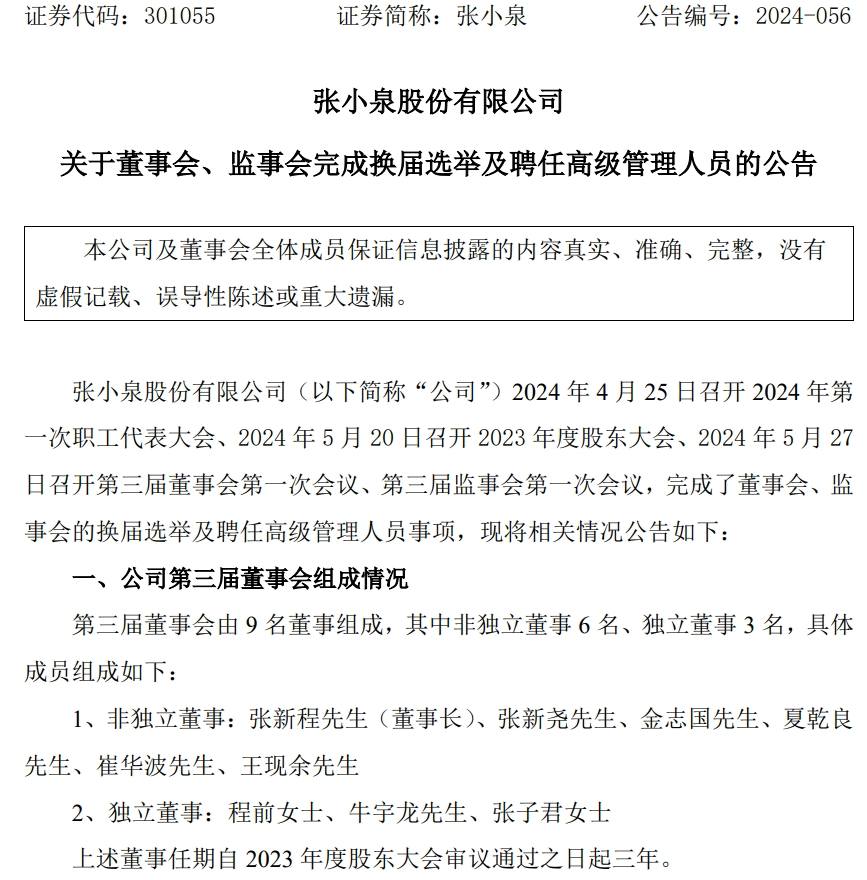 5月28日,张小泉公告披露董事会换届结果,实控人之一的张樟生不再担任董事长,由另一名实控人张国标之子、90后张新程接任;同时,张樟生之子、同样为90后的张新尧,获任公司董事、副总经理兼品牌营销中心总经理。