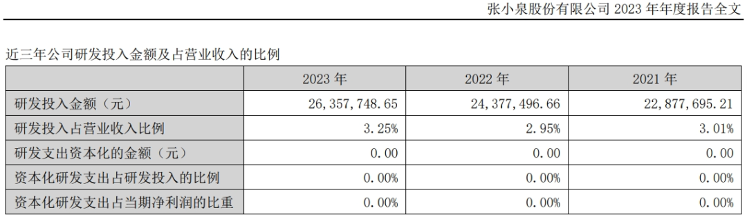 2021年,其研发投入约为0.23亿元,较上年增加不到300万元,近三年来,张小泉的研发都没有太大的起伏,依次是0.17亿元、0.2亿元、0.23亿元,研发投入占营收比分别为3.01%、3.51%、3.47%。