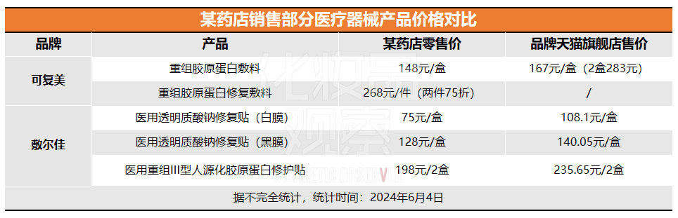 不过,部分品牌产品在做完活动后,其天猫旗舰店的价格要低于线下店,如可复美的一款重组胶原蛋白敷料,在天猫旗舰店的价格为167元/盒,高于线下店148元/盒的价格,但其两盒的价格为283元,低于线下店(线下店两盒为296元)。