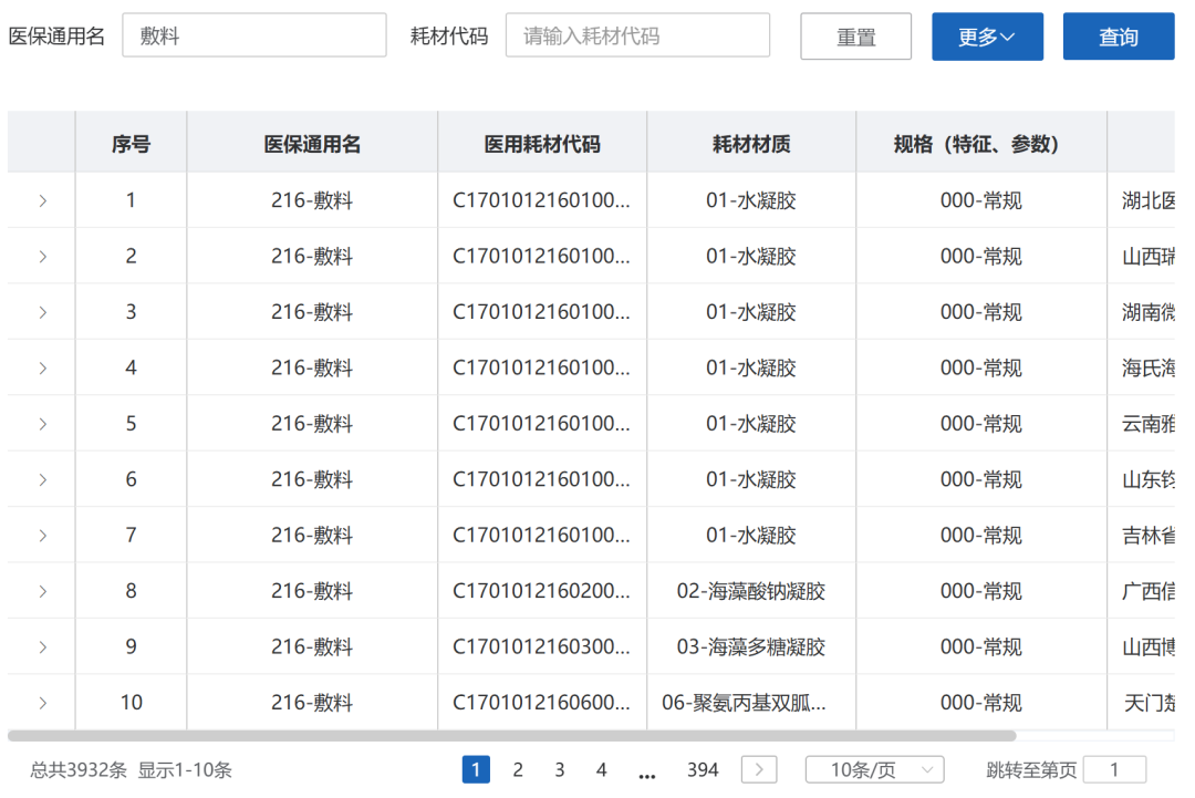 与此同时,《化妆品观察》在国家医保服务平台上搜索“敷料”,查询到3932条记录。