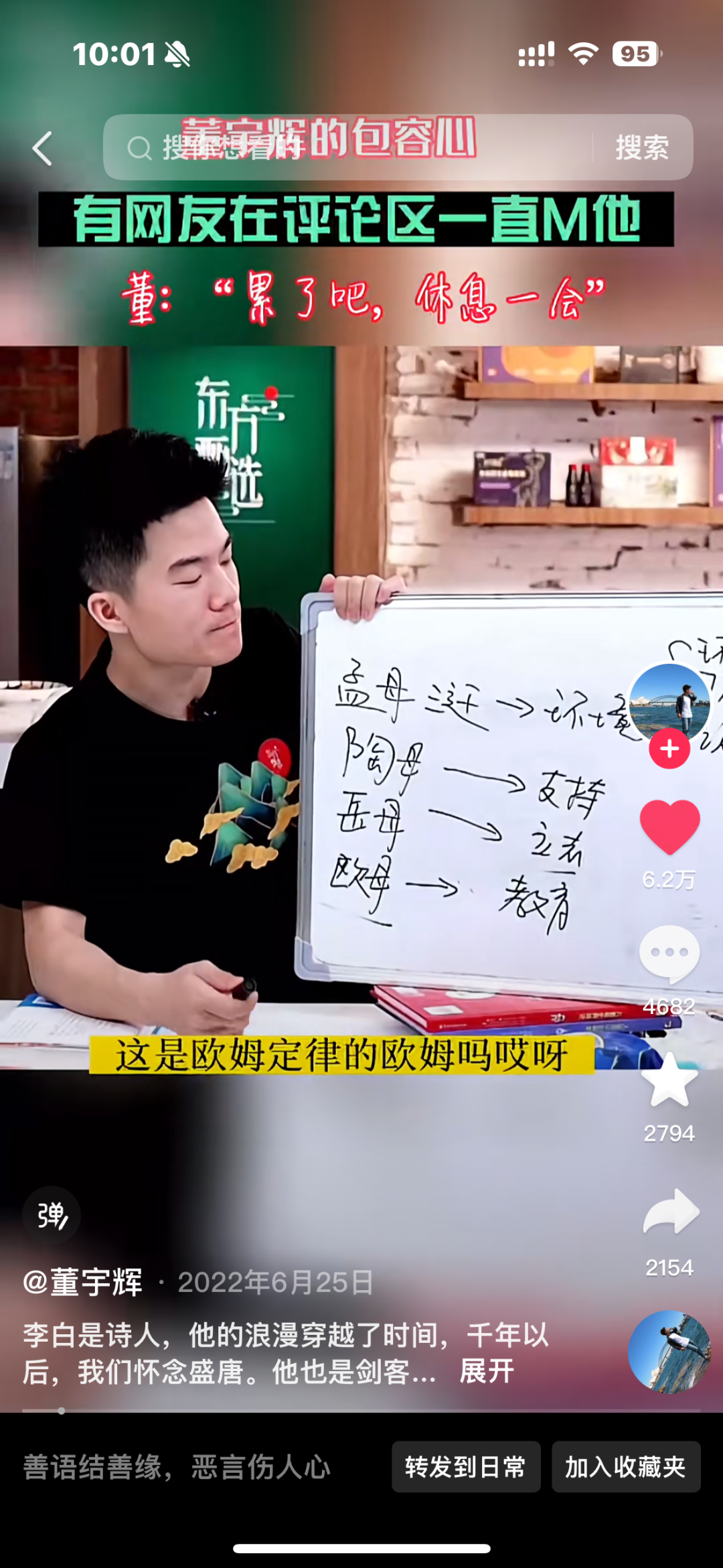 实际上,董宇辉才是在东方甄选带起知识直播风气的人。据了解,董宇辉经常因为“讲课”太投入而忘记卖货。董宇辉本人的饱读诗书也是撑起知识直播的关键因素。