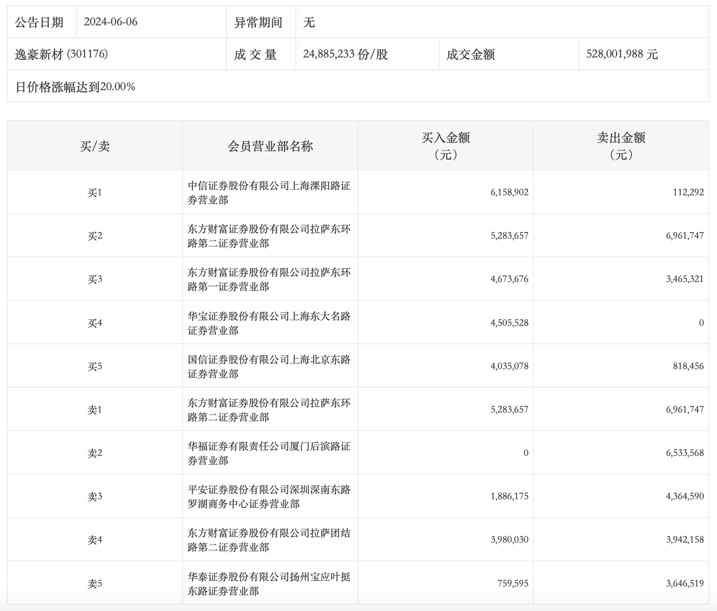 6月6日,逸豪新材今日涨停,龙虎榜数据显示,上榜营业部席位全天成交6112.73万元,占当日总成交金额比例为11.58%。其中,买入金额为3128.26万元,卖出金额为2984.47万元,合计净买入143.8万元。