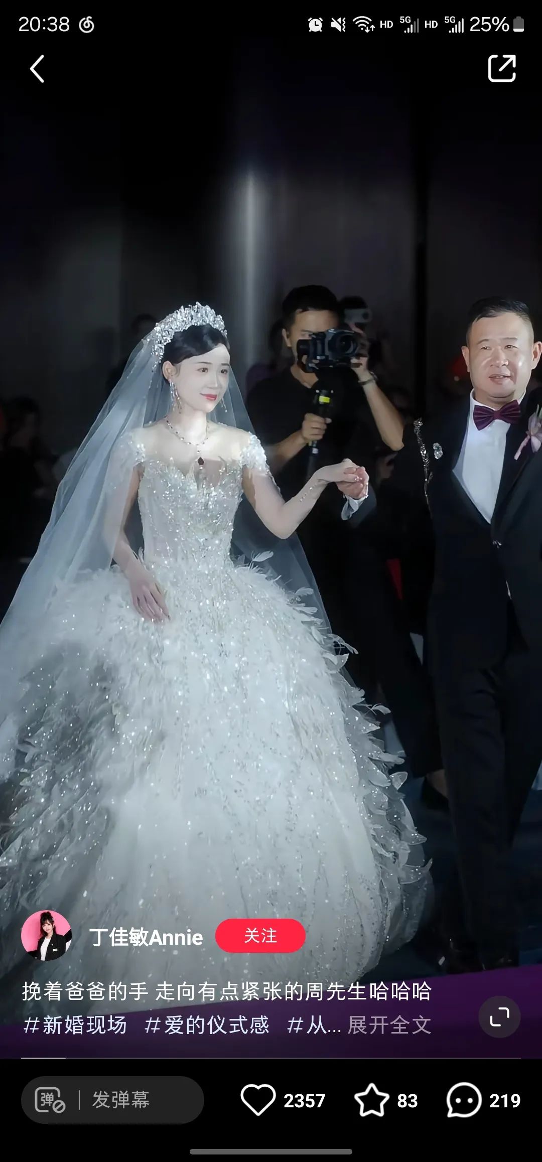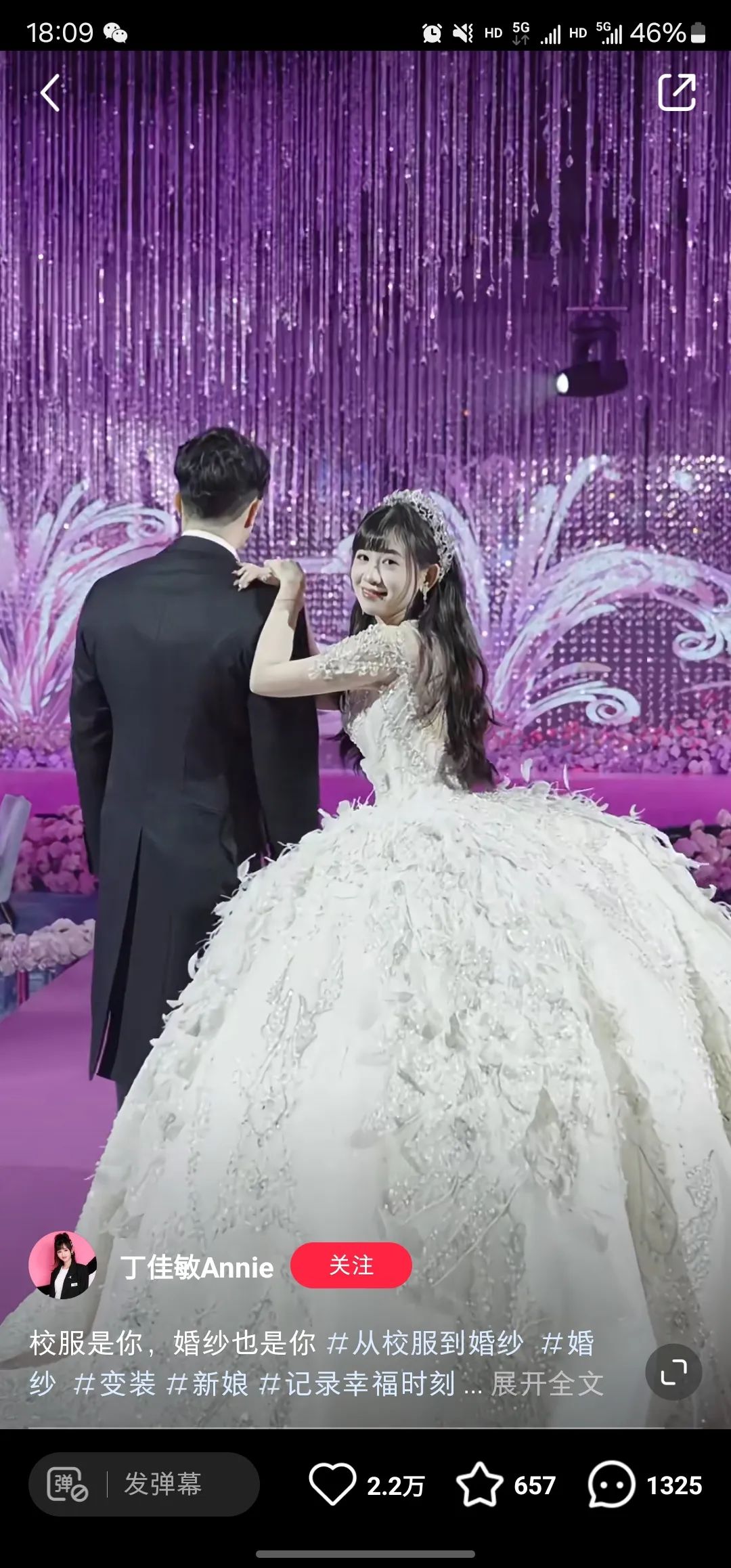 6月1日晚上,特步集团“二公主”丁佳敏在其社交媒体平台官宣了自己的喜讯,视频中,丁佳敏从身着校服变装为头戴皇冠、身着婚纱,周力源身着一身西装以背影站在身旁,并配文“校服是你,婚纱也是你”。