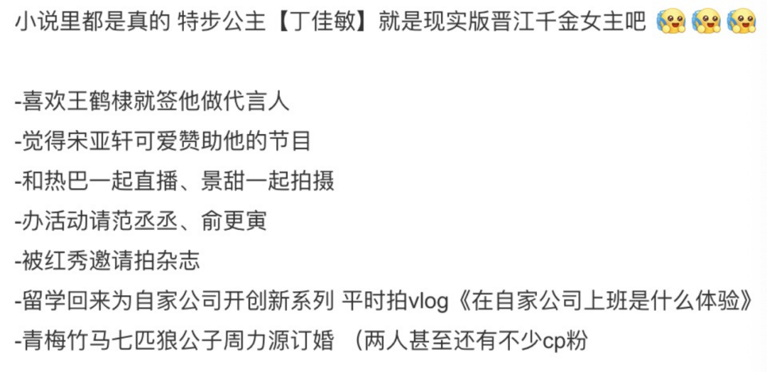 丁佳敏还曾和景甜一起拍摄、和迪丽热巴合体直播做宣传,和汪东城合拍视频,和范丞丞和俞更寅合影留念。有网友直呼“豪门公主追明星,看上谁就买下谁” “现实版晋江女主”。