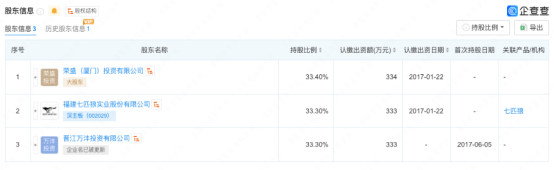 企查查显示,2015年,两岸青年(厦门)股权投资基金管理有限公司成立,股东为荣盛(厦门)投资有限公司、福建七匹狼实业股份有限公司,以及晋江万沣投资有限公司,分别持股33.4%、33.3%、33.3%。