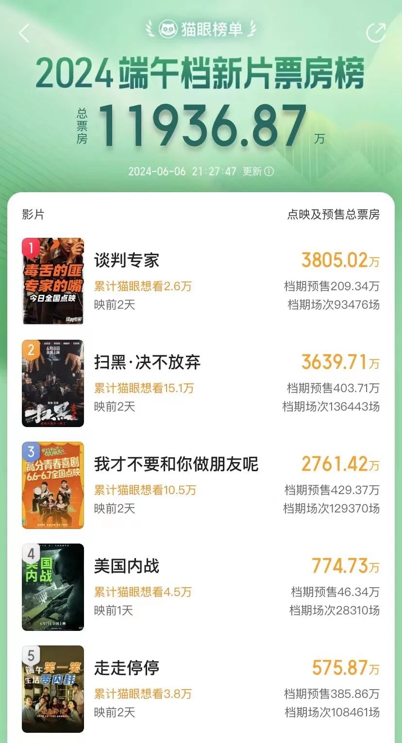 其中,改编自美国电影《王牌对王牌》的《谈判专家》暂列首位,“扫黑”系列的《扫黑·决不放弃》紧随其后,更早开启点映的青春片《我才不要和你做朋友呢》,目前点映及预售总票房也已达到2100万以上……首轮较量已然拉开。且经过初期声量释放后,部分影片已经开始调整发行节奏,比如由黄轩、柳岩主演的《来福大酒店》,就于6月4日官宣撤出端午档,新档期定在6月28日。