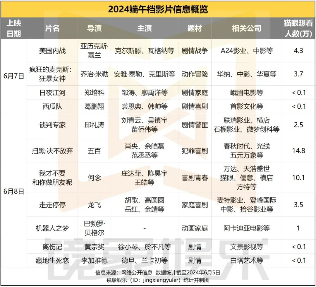 从这个角度来看,今年端午档集结11部影片便不难理解了,且影片覆盖的多元题材,也在受众市场呈现出相对更明显的区分。