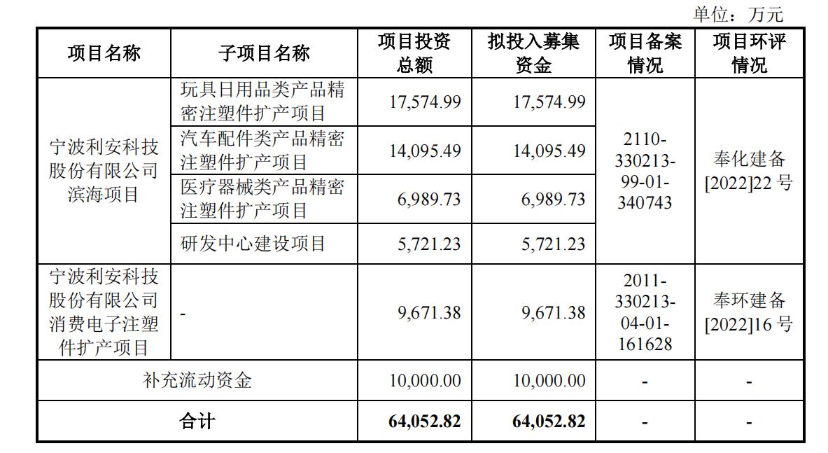 其中,滨海项目包括玩具日用品类产品精密注塑件扩产项目、汽车配件类产品精密注塑件扩产项目、医疗器械类产品精密注塑件扩产项目及研发中心建设项目,分别拟投入1.76亿元、1.41亿元、6989.73万元、5721.23万元。此外,消费电子注塑件扩产项目拟投入9671.38万元,补充流动资金1亿元。