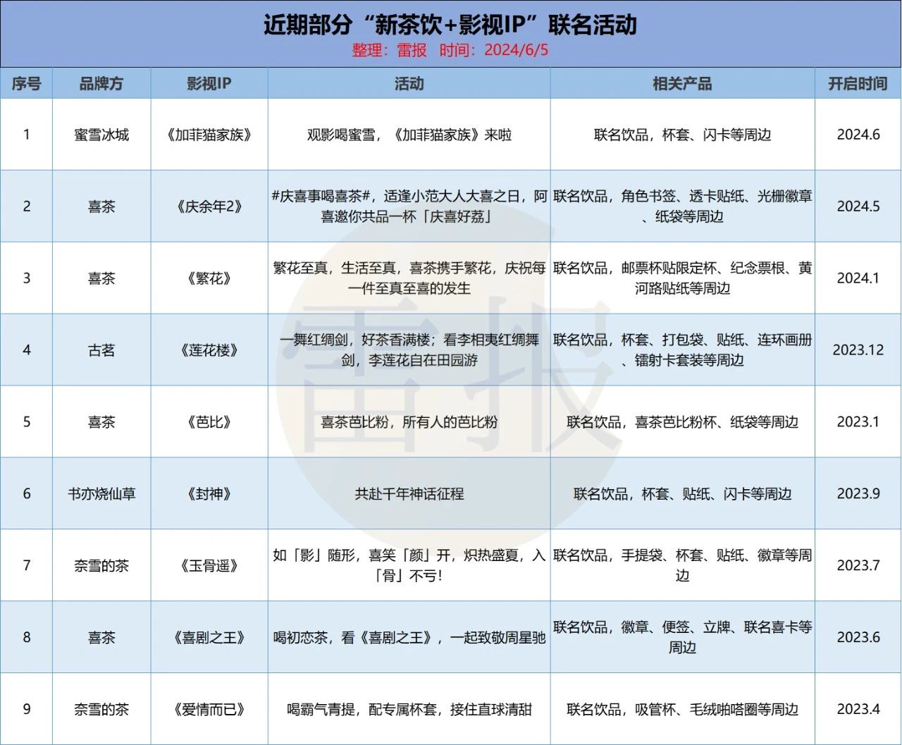 据此,雷报观察并统计了部分较为知名的“新茶饮+影视IP”联名活动,包括喜茶x《庆余年2》、喜茶x《繁花》、古茗x《莲花楼》、书亦x《封神》、奈雪x《玉骨遥》等等。