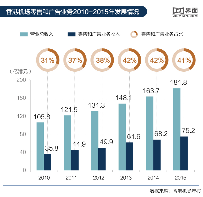 以全球最繁忙的航空枢纽之一香港机场为例,香港机场目前有两个客运大楼,一共有大概300间零售商铺和80家餐饮店。数据显示,2015年,香港机场的营收增长11.1%,达到181.8亿港元(约合161.18亿元人民币)。其中零售和广告业务收入提升了10.3%,达到75.2亿港元(约合66.67亿元人民币),占全部收入的41.4%,成为拉动机场营收增长的最大动力。