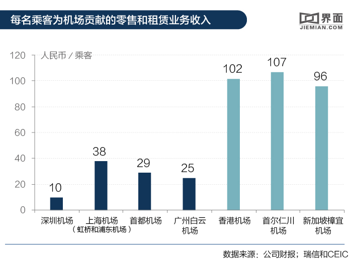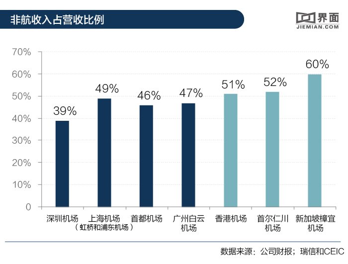 2016年5月份,瑞信(Credit Sussie)发表了一份分析中国机场的报告,其中一组数据显示:2015年,北上广深四大机场的非航收入占总营收的比例都没有超过50%。其中,上海机场比例最高,达到49%,主要是因为国际旅客比例高;深圳机场最低,只有39%,远远低于樟宜机场的60%以及香港机场的51%。
