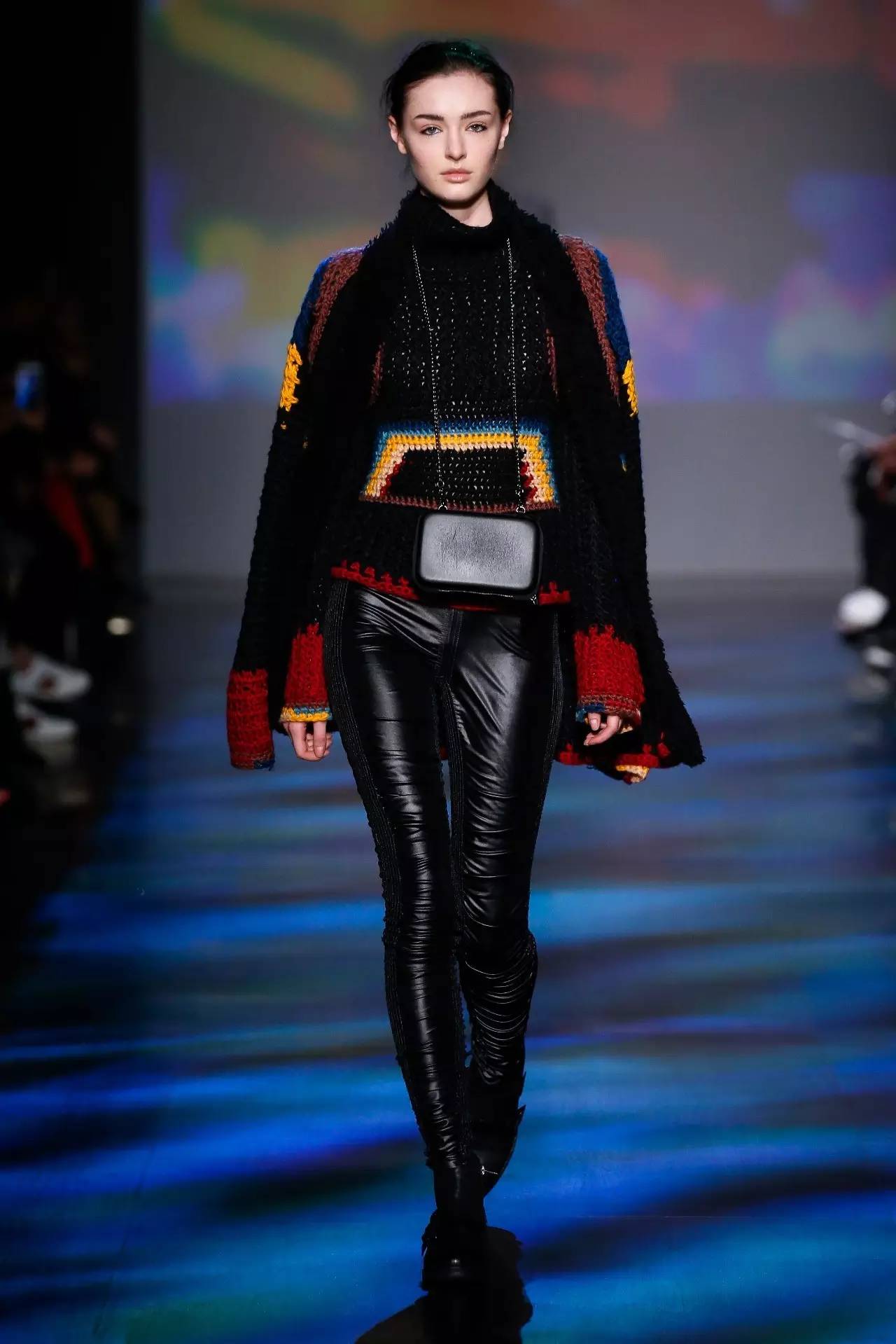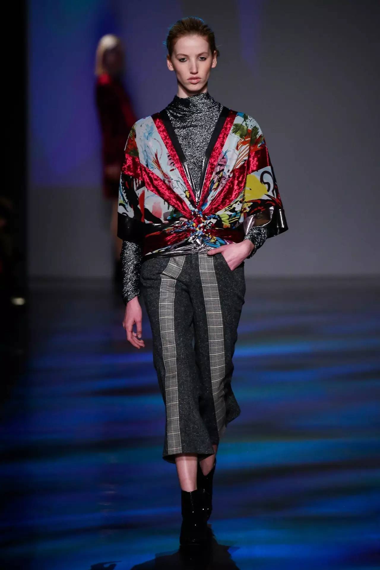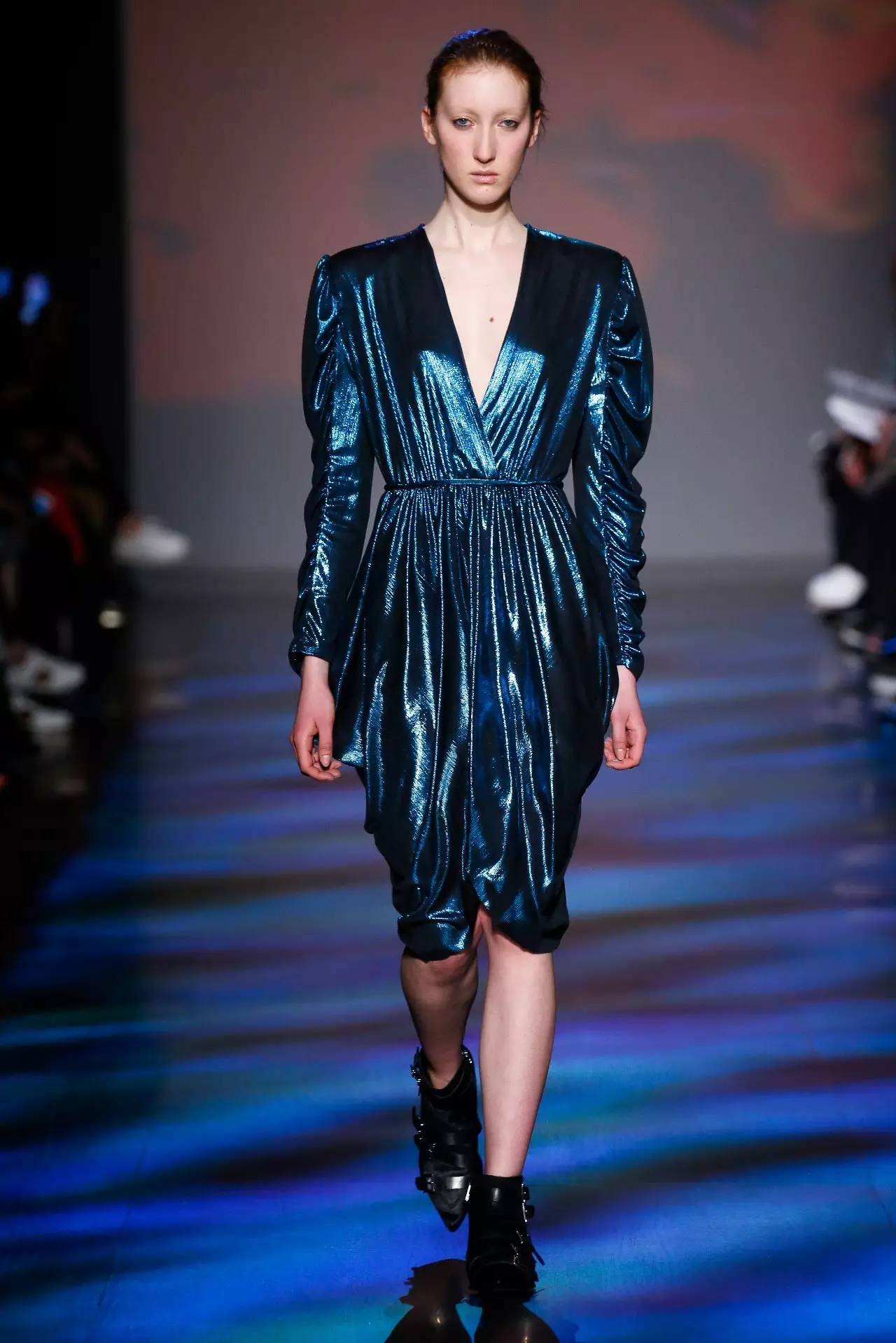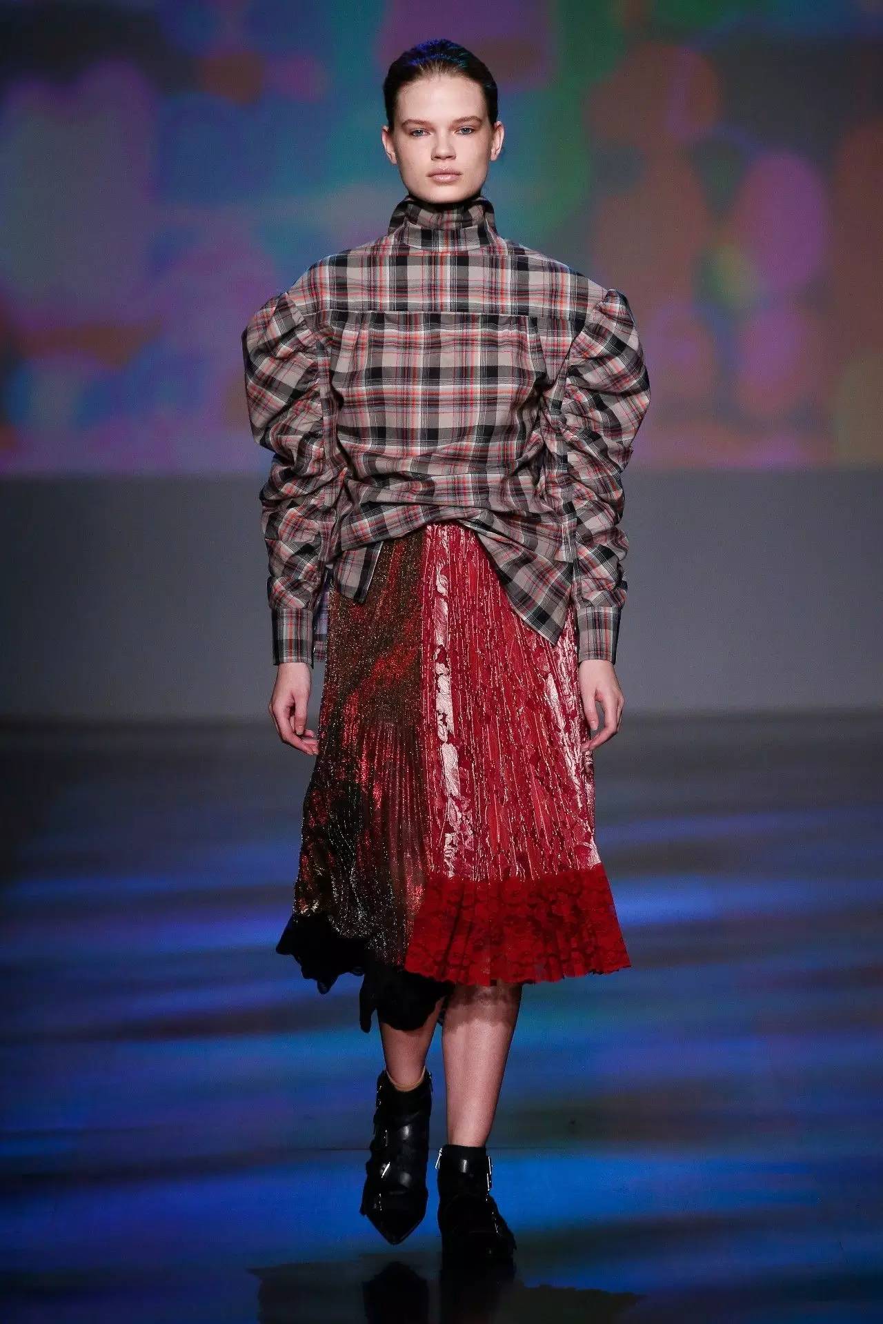温和的条纹和羊毛呢花恰到好处的舒缓了硬朗的金属质感针织和仿皮毛材质。真丝提花、亮片还有褶皱装饰的袖子搭配修身打底裤,以及拥有不规则下摆的蕾丝金属质感短裙加上宽大的休闲的垫肩上衣外套,无不充实着90年代经典流行复古风潮,同时又不失当代时尚感。